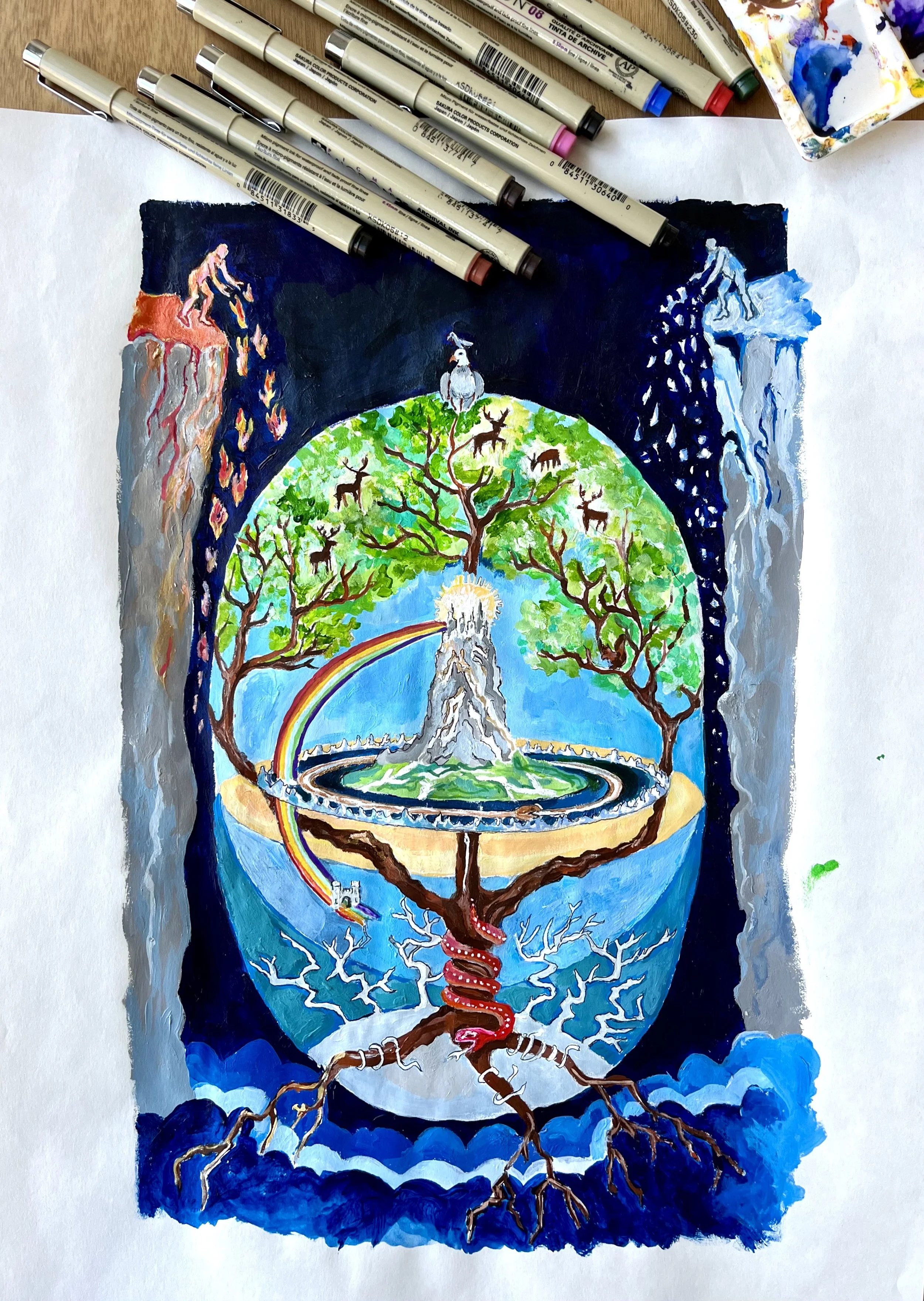 I began to wonder if this myth reflects the concept that as humans, we occupy a world that is fundamentally built on and reflected by a dialectic reality, that shows up in multiple planes between our external contextual environments and our internal bodies and psyches. It occured to me that perhaps the dialectical perspective is an ancient thought framework that emerged through art making that was built off of our sensory understanding of the physical world, and from there has evolved with thought traditions and cultural shifts—but still remains relevant to understanding and moving through our lives.
